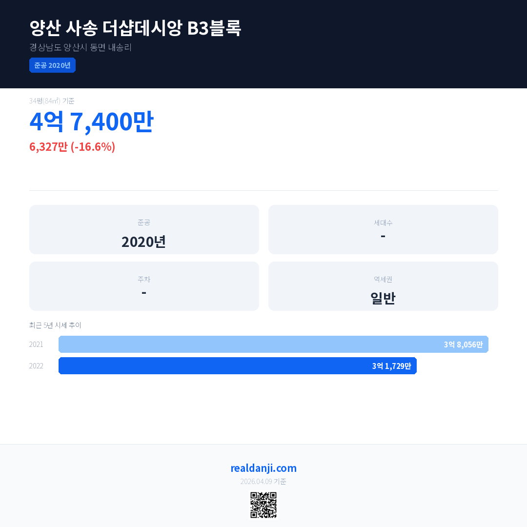 양산 사송 더샵데시앙 B3블록 국민평형 기준 2022년 평균 거래가는 3억 1,729만으로, 전년 대비 16.6% 하락 했습니다.