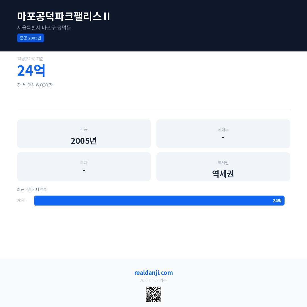 마포공덕파크팰리스Ⅱ 국민평형 기준 2026년 평균 거래가는 24억으로, 전년 대비 92.0% 상승 했습니다.