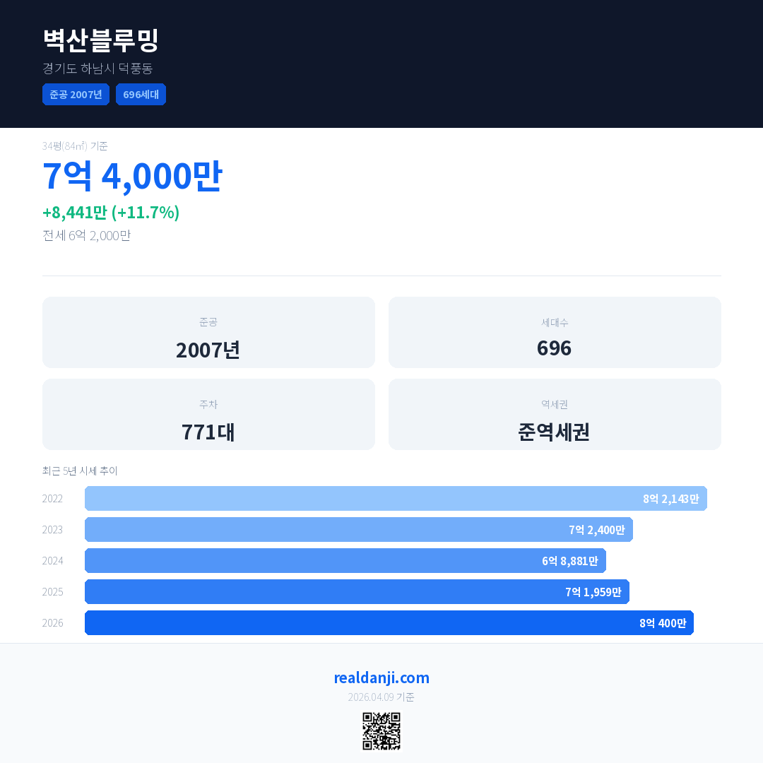 벽산블루밍 국민평형 기준 2026년 평균 거래가는 8억 400만으로, 전년 대비 11.7% 상승 했습니다.