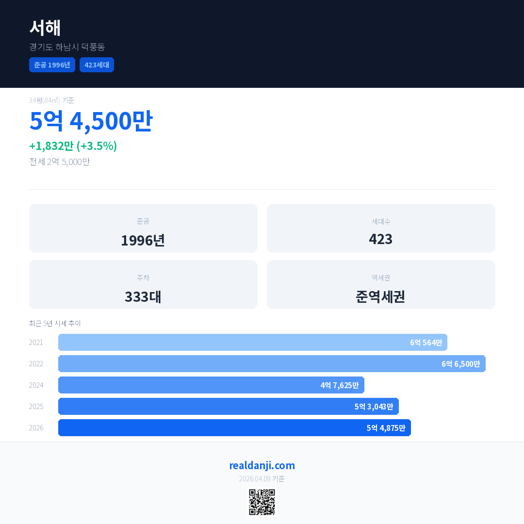 서해 국민평형 기준 2026년 평균 거래가는 5억 4,875만으로, 전년 대비 3.5% 상승 했습니다.