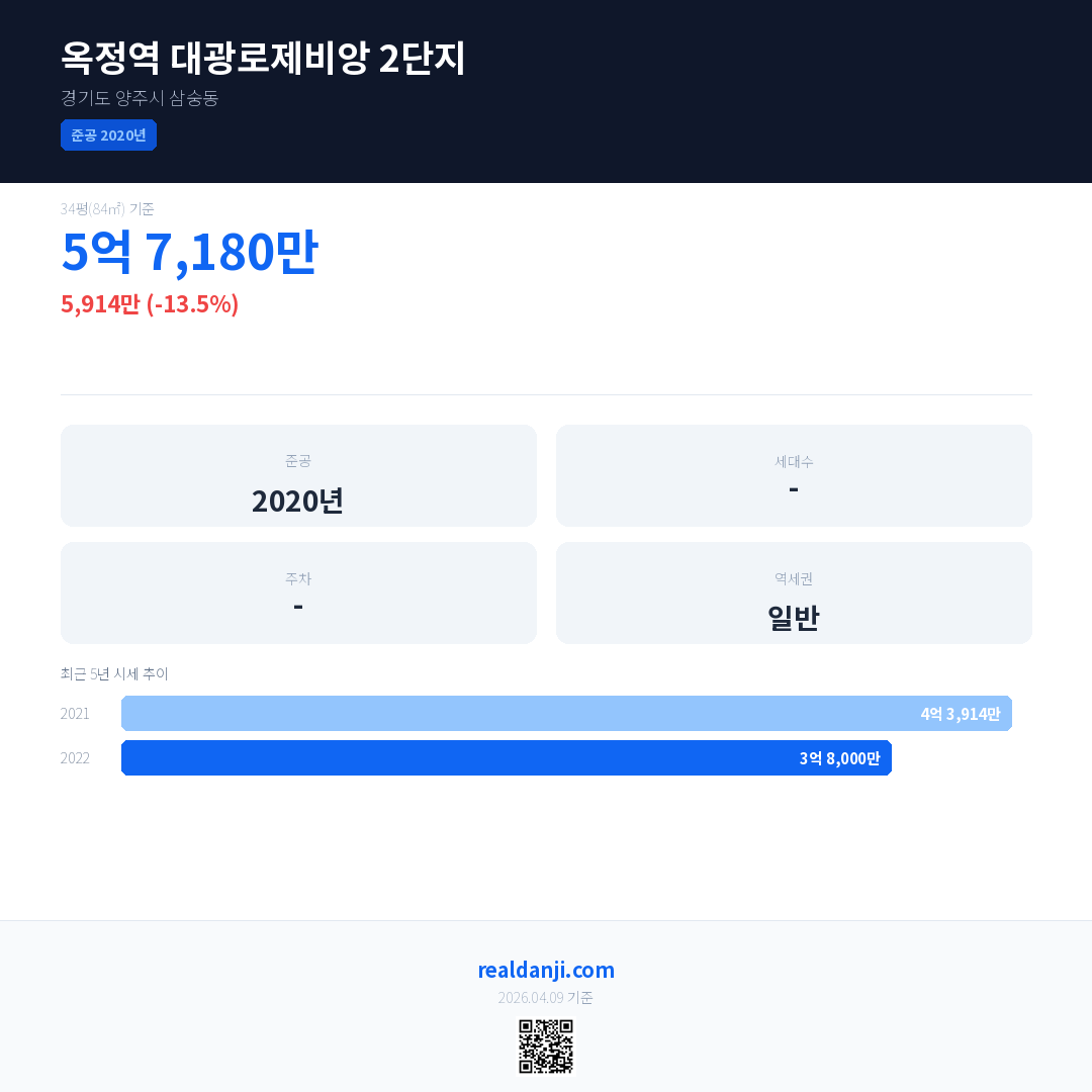 옥정역 대광로제비앙 2단지 국민평형 기준 2022년 평균 거래가는 3억 8,000만으로, 전년 대비 13.5% 하락 했습니다.