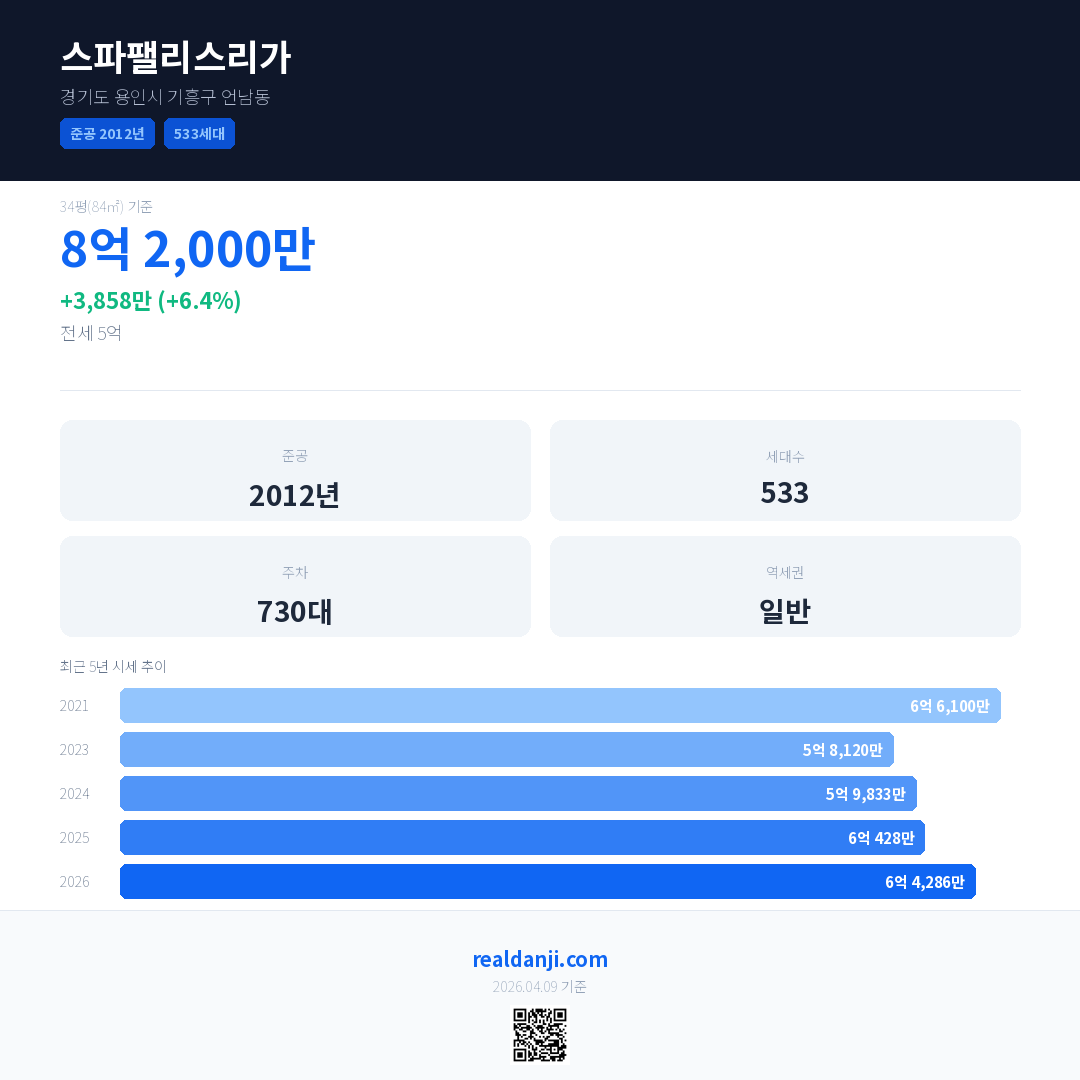 스파팰리스리가 국민평형 기준 2026년 평균 거래가는 6억 4,286만으로, 전년 대비 6.4% 상승 했습니다.