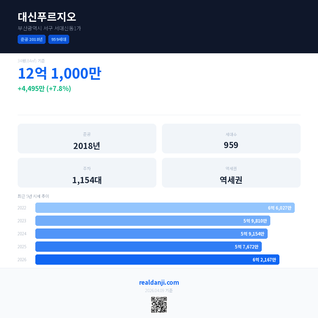 대신푸르지오은(는) 2018년에 준공되었으며, 현재 8년차입니다. 총 959세대 규모입니다.