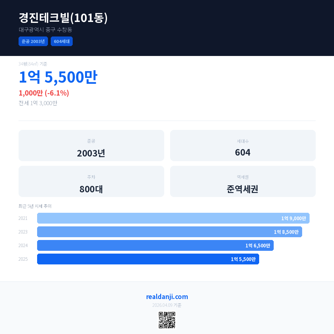 경진테크빌(101동) 국민평형 기준 2025년 평균 거래가는 1억 5,500만으로, 전년 대비 6.1% 하락 했습니다.