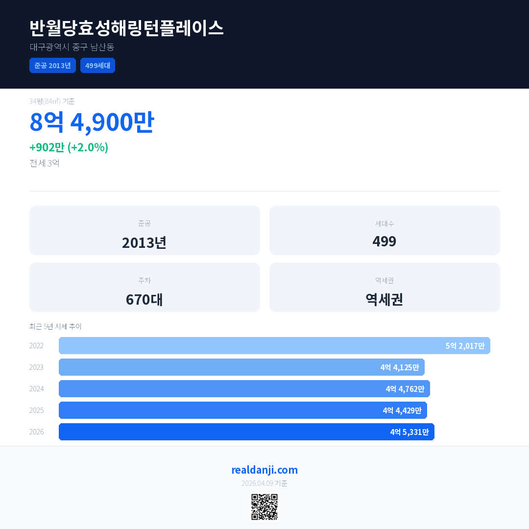반월당효성해링턴플레이스 최근 거래가는 8억 4,900만입니다. (2026-04)