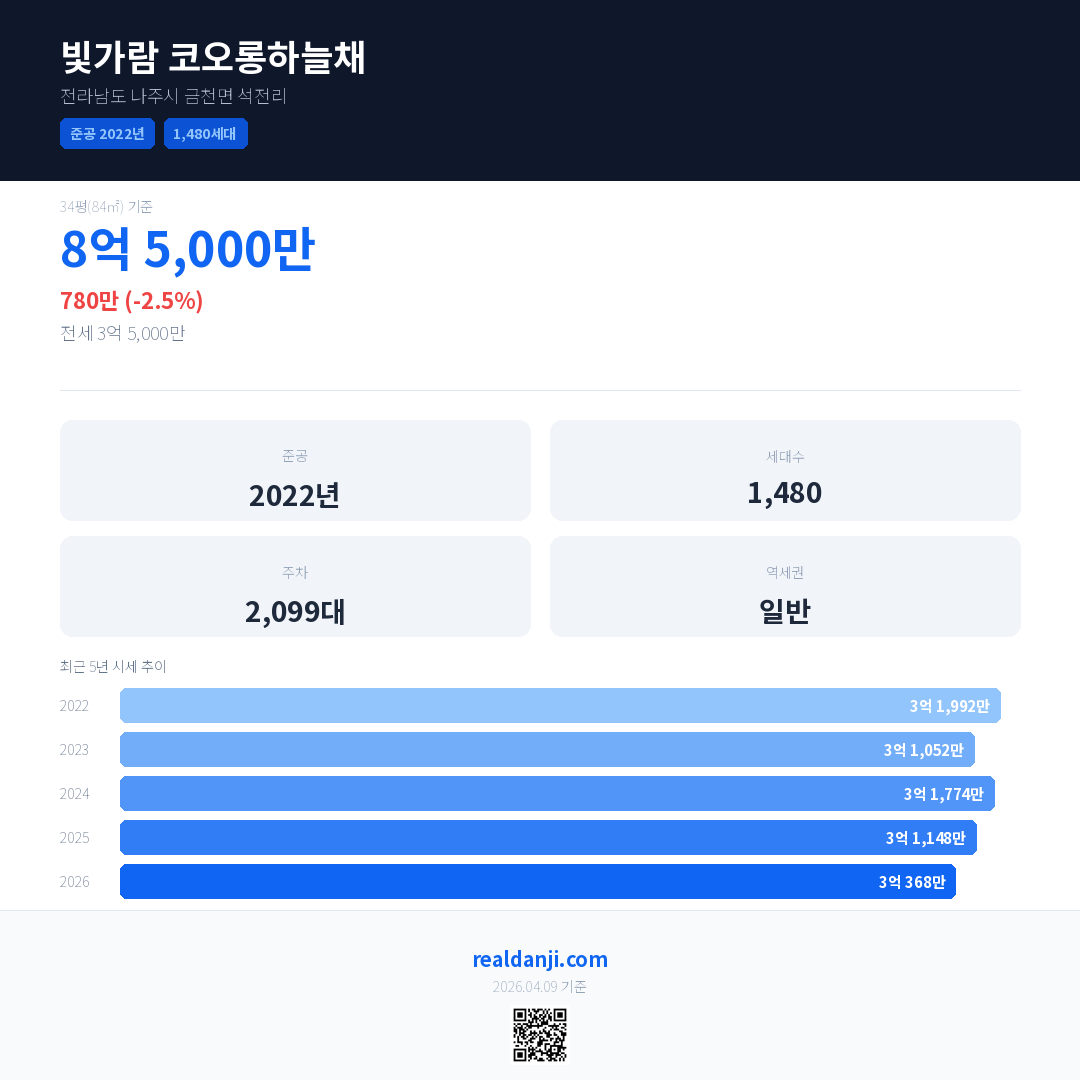 빛가람 코오롱하늘채 국민평형 기준 2026년 평균 거래가는 3억 368만으로, 전년 대비 2.5% 하락 했습니다.